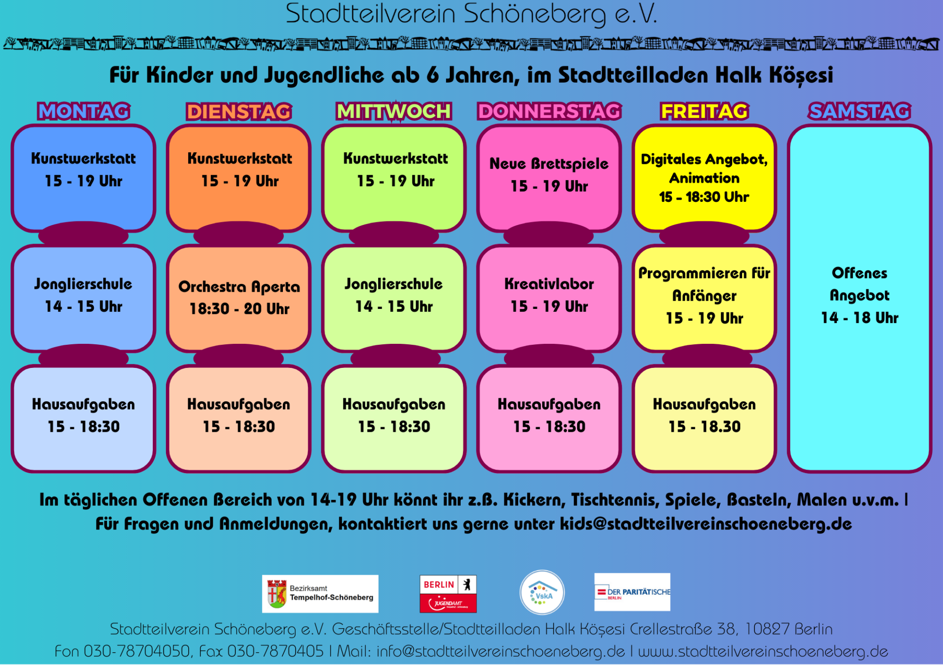 Im Stadtteilladen Halk Köșesi des Stadtteilverein Schöneberg e.V. bieten wir ein vielfältiges Programm für Kinder und Jugendliche ab 6 Jahren aus dem Schöneberger Süden und Norden an. Unser Ziel ist es, einen offenen, kreativen und verlässlichen Ort im Stadtteil zu schaffen, an dem Kinder und Jugendliche ihre Fähigkeiten entdecken, neue Interessen entwickeln und sich wohlfühlen können. Im Mittelpunkt stehen dabei kreative Angebote, Bewegung und Unterstützung im schulischen Alltag.